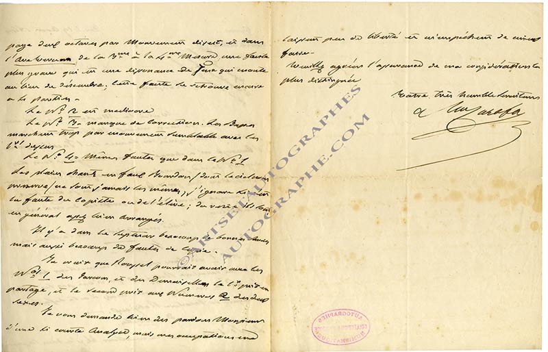Lettre autographe signéeLettre autographe signée, adressée à M. Dufau. Paris, 19 août 1844 ; 2 pages 1/2 in-4°. En-tête « Gymnase Musical militaire ». Longue lettre musicale : « Voici la musique que j’ai vue et corrigée de mon mieux. M. Onslow, qui est...