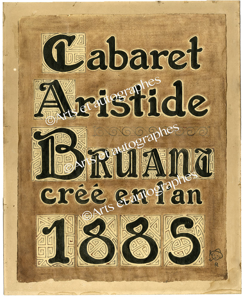Maquette d'enseigneMaquette d’enseigne : « Cabaret Aristide Bruant créé en l’an 1885 ».Encre de Chine et lavis de bistre.42,5 x 33,5 cm.Monogrammé « R » (avec tête d’homme coiffé d’un chapeau et fumant la pipe) en bas à droite.