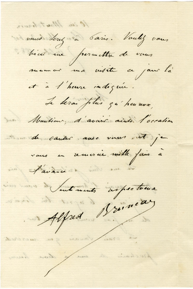 Lettre autographe signéeLettre autographe signée. Paris, 7 octobre 1882 ; 2 pages in-12. « Notre ami commun, Monsieur Paul Collin, m’a chargé de vous remettre une lettre. Je me suis présenté deux fois pour avoir l’honneur de vous voir, et j’ai le...