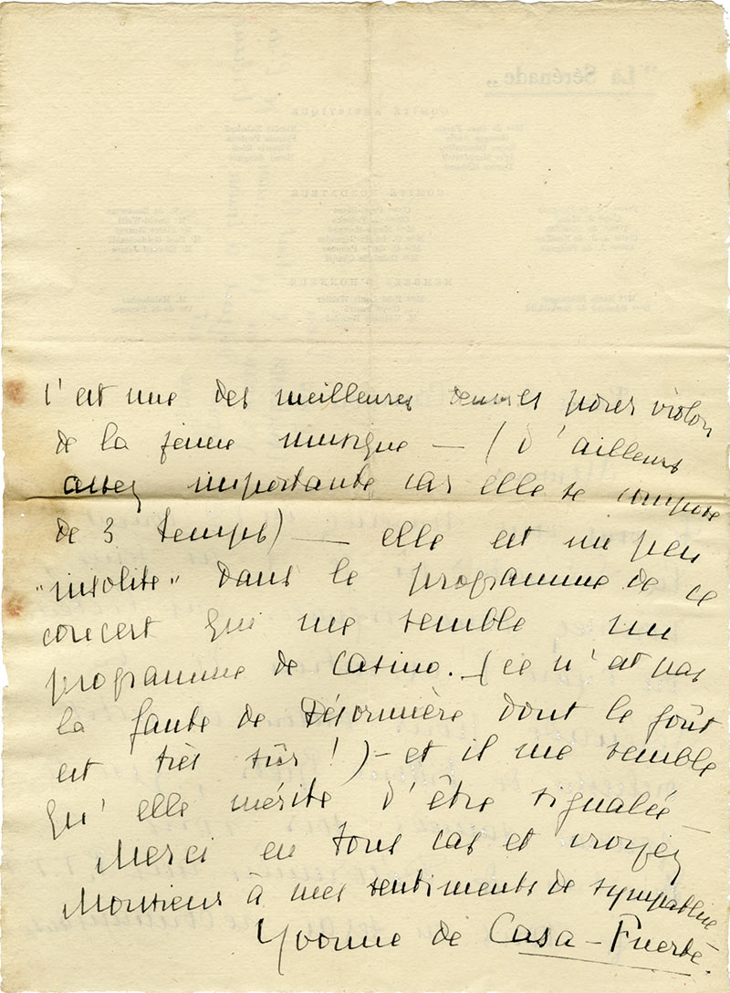 Lettre autographe signéeLettre autographe signée, adressée à M. Templier, au Figaro. Sans date ; 2 pages in-4° sur papier à en-tête de “La Sérénade”.« Si vous vous souvenez du 1er concert de la Sérénade, où je l’ai jouée, voudriez-vous signaler...