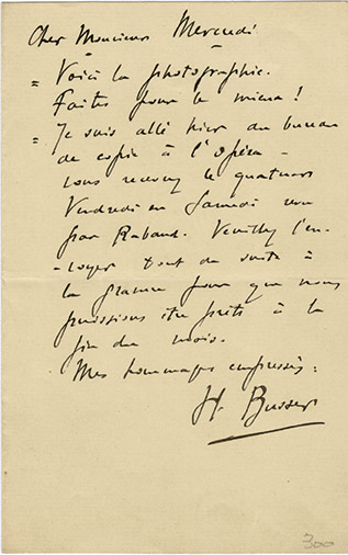 Lettre autographe signéeLettre autographe signée. « Vendredi » ; 1 page in-16 oblongue. « Voici le scherzo à 2 mains revu très soigneusement par Mlle Long et moi au point de vue pianistique. Comme Mme Chèné ma promis de le faire jouer à toutes ses...