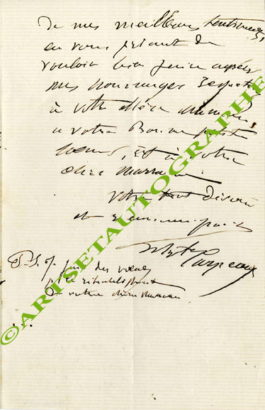 Lettre autographe signéeLettre autographe signée, adressée à une « Chère Petite Amie ». 18 novembre 1874 ; 2 pages 1/2 in-8° d’une écriture difficile qui évoquent la souffrance qu’il endurait. Il la remercie de sa lettre qui lui annonce sa visite. «...