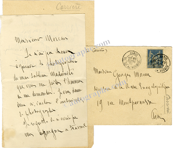 Ensemble de lettres autographes signées2 lettres autographes signées, adressées à Georges Moreau, directeur de la Revue Encyclopédique Larousse. 1891-1892 ; ensemble de 3 pages in-12, collées ensemble. « Je n’ai pu trouver d’épreuve photographique de mon tableau...
