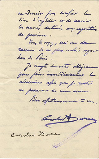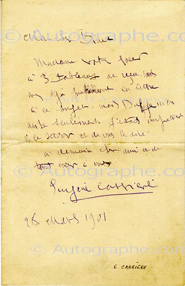 Lettre autographe signéeLettre autographe signée, adressée à M. Binet. 25 mars 1901 ; 1 page in-8°. « Madame votre sœur a 3 tableaux de reçu. Vous avez déjà probablement eu une lettre à ce sujet. Mais Dubufe m’en avise seulement. J’étais impatient...
