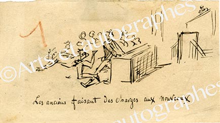 Dessin autographe caricaturalDessin original. [Vers 1874] ; 8,5 x 15,5 cm. Dessin paru dans le Charivari. Amusant dessin autographe caricatural sur l’Assemblée nationale sur les nouveaux députés : « Les anciens faisant des charges aux nouveaux »