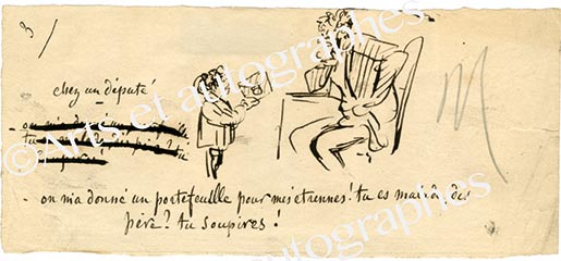 Dessin autographe caricaturalDessin original. [Vers 1869] ; 8 x 18 cm. Dessin paru dans le Charivari. Amusant dessin autographe caricatural légendé « Chez un député ». « On m’a donné un portefeuille pour mes étrennes ! tu es malade, dis père ? Tu soupires...