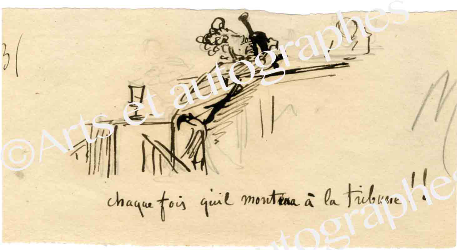 Dessin autographe caricaturalDessin original. [Seconde moitié du XIXe siècle] ; 8 x 15 cm. Dessin pour le Charivari. Amusant dessin autographe caricaturant l’Assemblée nationale : « Chaque fois qu’il montera à la tribune ! »
