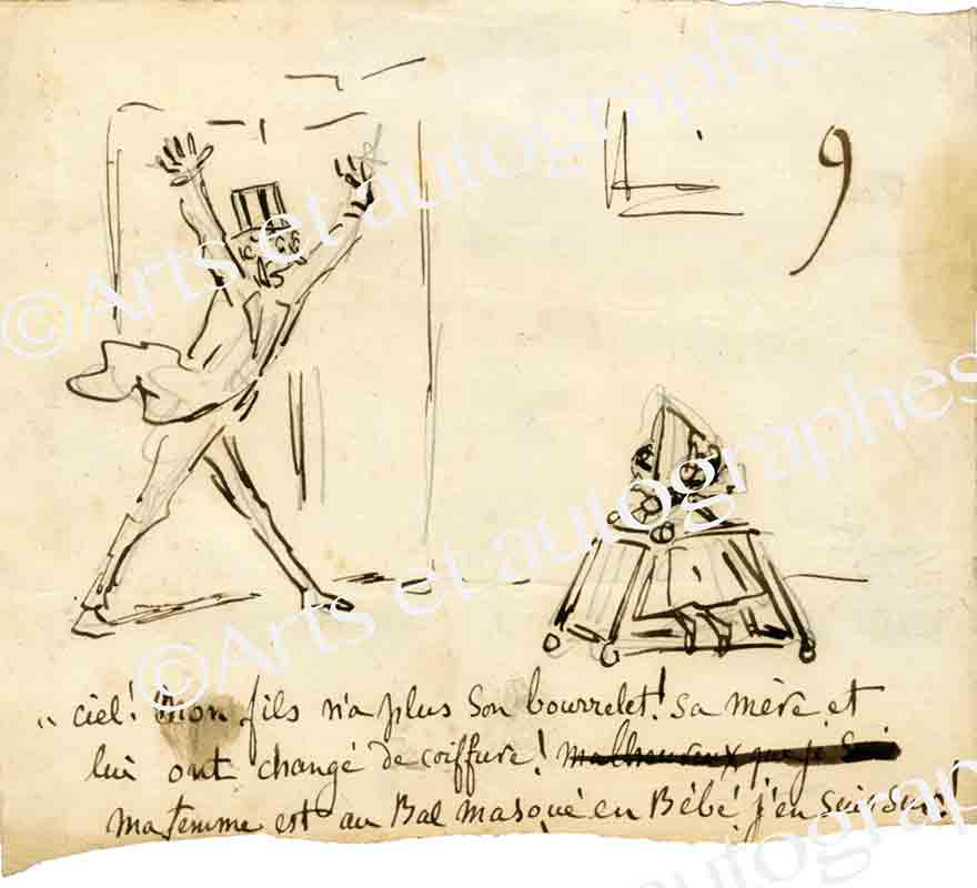 Dessin autographe caricaturalDessin original. [Seconde moitié du XIXe siècle] ; 13 x 15,5 cm. Dessin pour le Charivari. Amusant dessin autographe caricatural légendé : « Ciel ! Mon fils n’a plus son bourrelet ! Sa mère et lui ont changé de coiffure ! Ma femme...