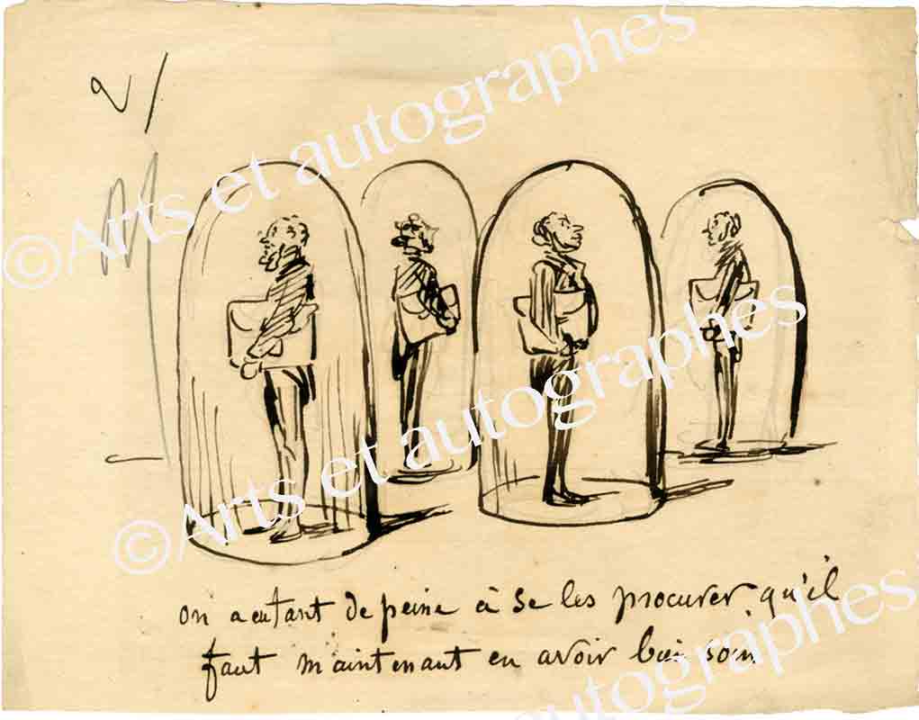 Dessin autographe caricaturalDessin original. [Seconde moitié du XIXe siècle] ; 14 x 18 cm. Dessin pour le Charivari. Amusant dessin autographe : « On a eu tant de peine à se les procurer qu’il faut maintenant en avoir bien soin. »