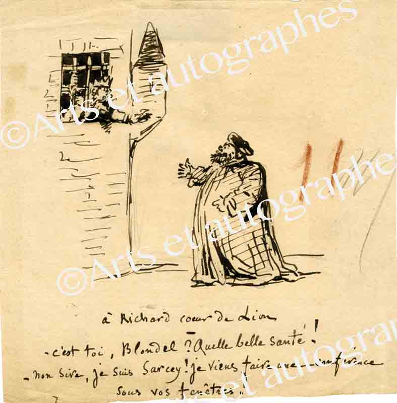 Dessin autographe caricaturalDessin original. [Seconde moitié du XIXe siècle] ; 15 x 15 cm. Dessin pour le Charivari. Amusant dessin autographe caricatural légendé : « À Richard Cœur de Lion ». « — C’est toi, Blondel ? Quelle belle santé ! — Mon sire,...