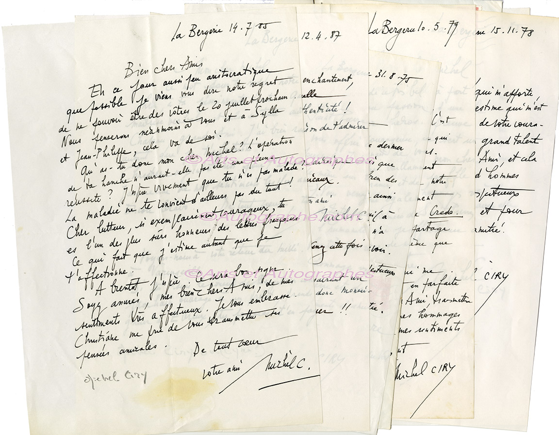 Ensemble de lettres autographes signées7 lettres autographes signées, adressées à M. de Saint-Pierre ; quelques enveloppes jointes. On joint un carton d’invitation à un vernissage des œuvres de Michel Ciry en 1992 avec envoi. Belle correspondance. Il lui promet de passer...