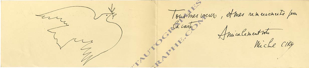 carte autographe signéeCarte autographe signée, adressée à Raymond Nacenta, directeur de la galerie Charpentier. 9,5 x 43,5 cm, pliée au centre. Carte de vœux avec dessin (au stylo Rotring) représentant une colombe. « Tous mes vœux, et mes...