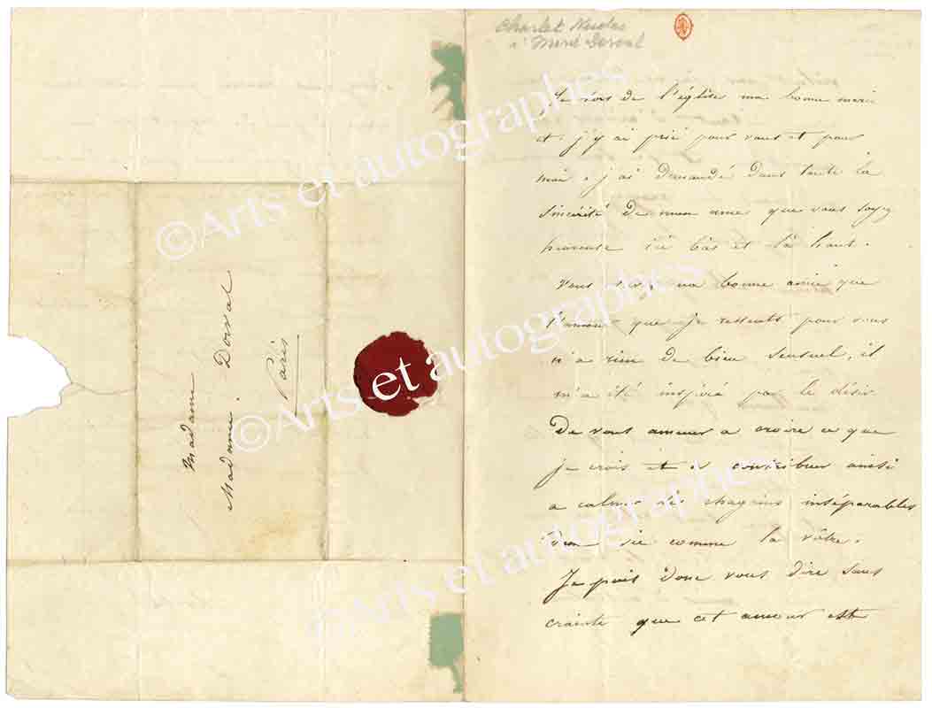 Lettre autographe signéeLettre autographe signée, adressée à Marie Dorval. Sans date ; 3 pages in-8°, avec adresse et cachet de cire. Très belle lettre d’amour. « Je sors de l’église, ma bonne Marie, et j’y ai prié pour vous et pour moi. J’ai...