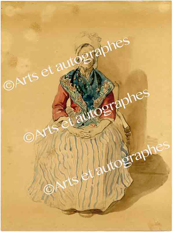 (Aquarelle attribuée à)Aquarelle représentant une vieille femme, attribuée à Charlet.XIXe siècle ; 22 x 29,5 cm.Non signée.