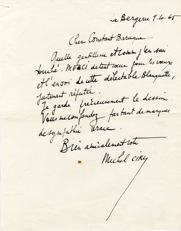 Ensemble de 5 lettres autographes signées, adressées au peintre Constant BaruqueEnsemble de 5 lettres autographes signées, adressées au peintre Constant Baruque. De 1964 à 1967 ; formats in-4°, enveloppes jointes :— « Voici la dédicace. Je vous avais répondu à vos voeux, par mon arlequin, messager des miens...