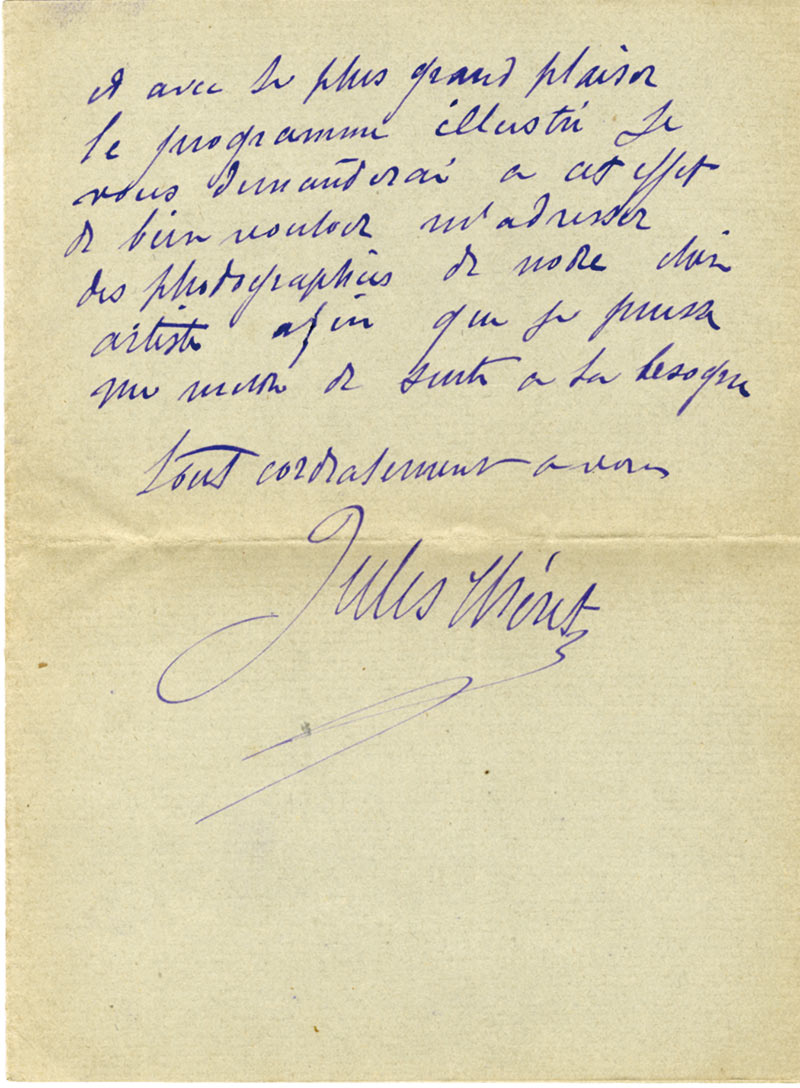 Lettre autographe signéeLettre autographe signée. Nice, le 5 avril 1901 ; 2 pages in-12. « Je suis le plus heureux d’être des vôtres au comité d’organisation pour le bénéfice de notre grande artiste, Marie Laurent, malheureusement ce ne pourra être...