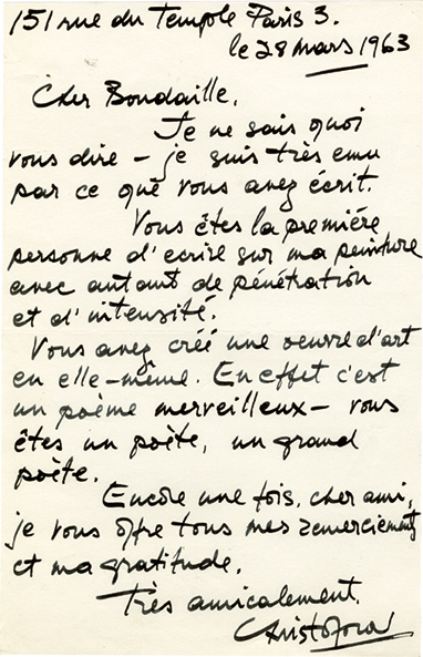 Lettre autographe signéeEnsemble de 3 lettres autographes signées, adressées au critique dart Georges Boudaille. Paris, 21 mars 1963 ; 1 page in-4°. « Cher Boudaille, jai vu Les Lettres françaises et je suis très content. Cest encore grâce à...