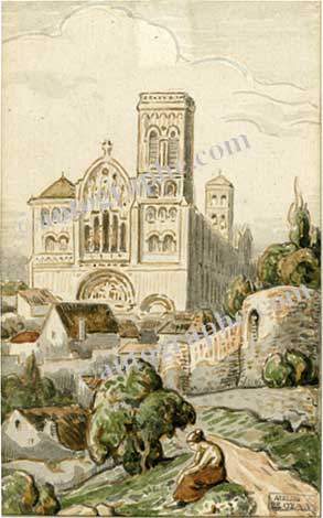 AquarelleLa basilique. Aquarelle sur papier portant le cachet de l’atelier. 115 x 190 mm à vue. Pièce encadrée.