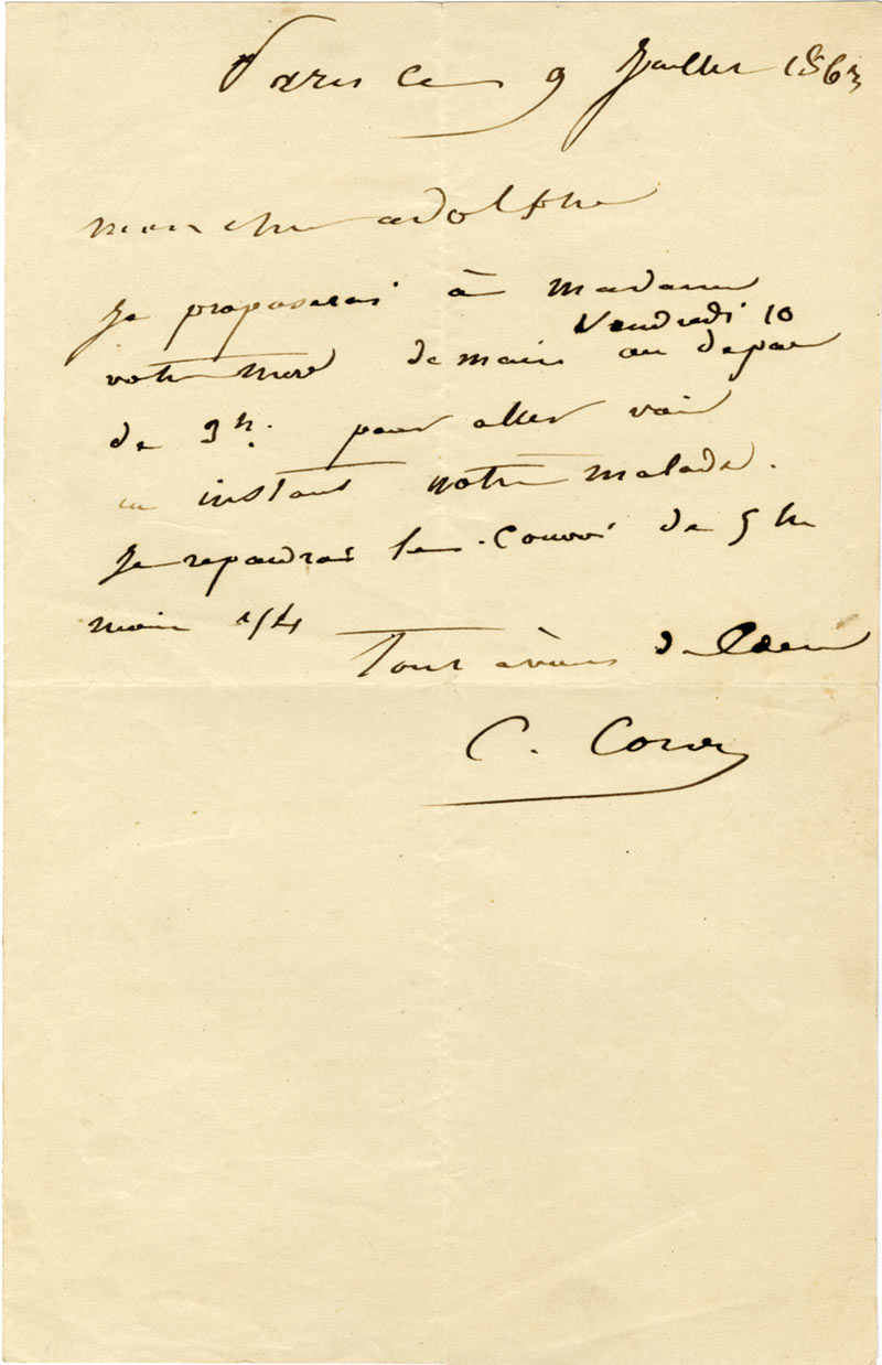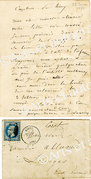 Lettre autographe signéeLettre autographe signée, adressée à Amédée Alluand. [Livry] ; 27 juin 1870 ; 1 page in-8°, enveloppe timbrée jointe. « Votre lettre m’a navré, je vous prierais donc de remercier la commission de sa bonne disposition pour moi;...