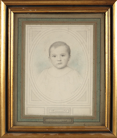 Dessin signéDessin signé. 31,5 x 23,5 cm. Joli portrait d’enfant légendé « Romuald ». Encadré.