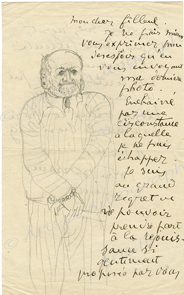 Lettre autographe signéeLettre autographe signée, avec dessin, adressée à son filleul. Sans date ; 2 pages in-8°. Dessin en vis à vis du texte le représentant enchaîné. « Je ne puis mieux vous exprimer mon désespoir qu’en vous envoyant ma dernière...