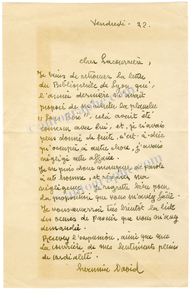 Lettre autographe signéeLettre autographe signée [adressée à l’atelier de gravure Lacourière-Frélaut]. Sans date [1932] ; 2 pages 1/2 in-4°.« Je viens de retrouver la lettre du Bibliophile de Lyon qui, l’année dernière m’avait proposé de...
