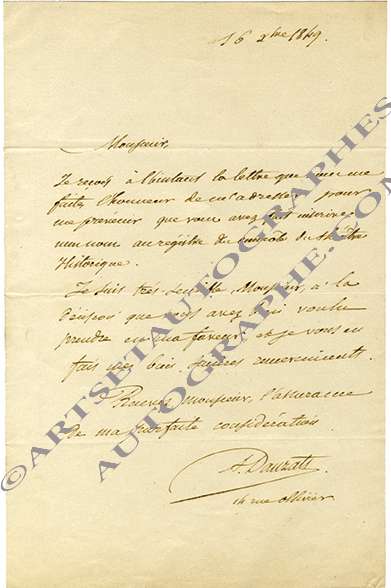 Lettre autographe signéeLettre autographe signée. 16 décembre 1849 ; 1 page in-8°. Il remercie son correspondant « d’avoir fait insérer mon nom au registre du contrôle du Théâtre Historique. Je suis bien sensible, Monsieur, à la décision que vous avez...