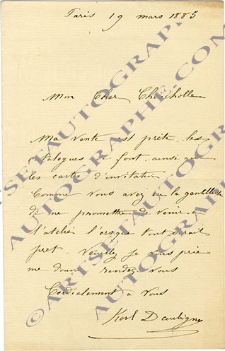 Carte autographe signéeLettre autographe signée, adressée à Charles Chincholle. Paris, 19 mars 1885 ; 1 page in-8°. « Ma vente est prête, les catalogues se font ainsi que les cartes d’invitation. Comme vous avez eu la gentillesse de me promettre de venir...
