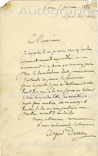 Lettre autographe signéeLettre autographe signée. Paris, 1er février 1883 ; 1 page in-8°. « Je regrette de ne pouvoir vous répondre affirmativement aujourd’hui en vous remerciant de la peine que vous avez prise pour les deux bordures dont j’aurais besoin....