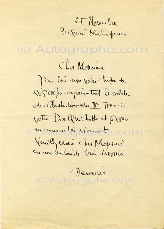 Lettre autographe signéeLettre autographe signée. Paris, 25 novembre ; 1 page in-4°. Il remercie son correspondant pour le « chèque de 205 000 frs représentant le solde des illustrations du IIIe tome de votre Don Quichotte ».