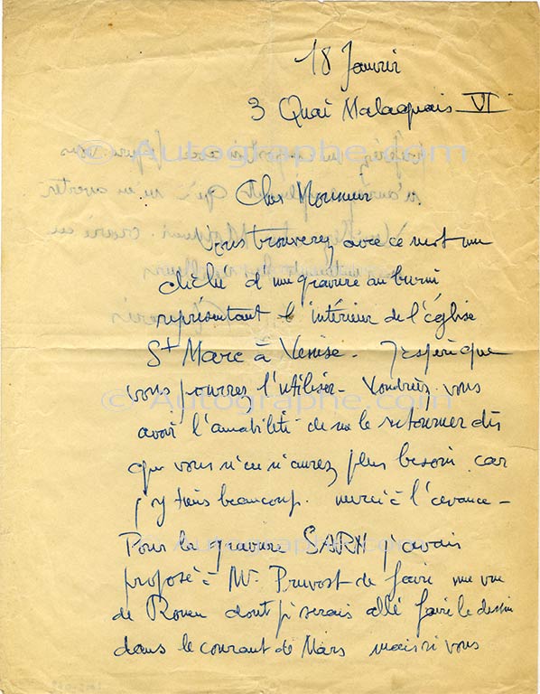 Lettre autographe signéeLettre autographe signée, adressée au peintre Émile Henry Tilmans. Paris, 18 janvier ; 1 page 1/2 in-4°. « Vous trouverez avec ce mot un cliché d’une gravure au burin représentant l’intérieur de l’église Saint-Marc à Venise....