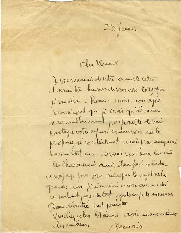 Lettre autographe signéeLettre autographe signée, adressée au peintre Émile Henry Tilmans. 23 janvier ; 1 page in-4°. Il sera heureux de le retrouver à Rouen mais son prochain voyage y sera tellement court qu’il ne pourra le voir. « Il me faut attendre ce...