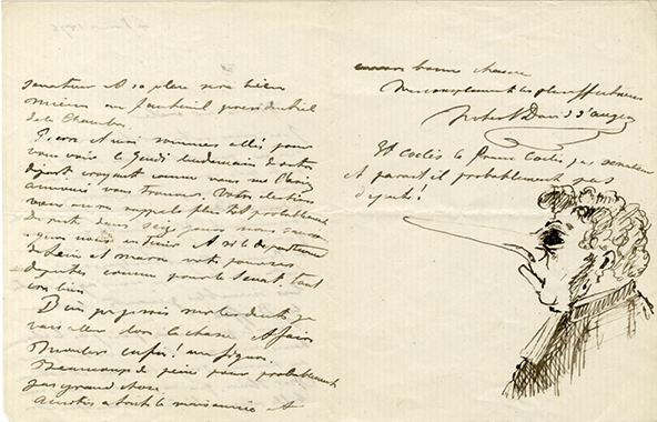 Lettre autographe signéeLettre autographe signée avec dessin, adressée à son oncle. 4 février 1876 ; 3 pages in-12. Il le félicite sur sa profession de foi qu’il faudrait envoyer au Courrier de France, qui fait campagne contre « les meubles gênants comme...