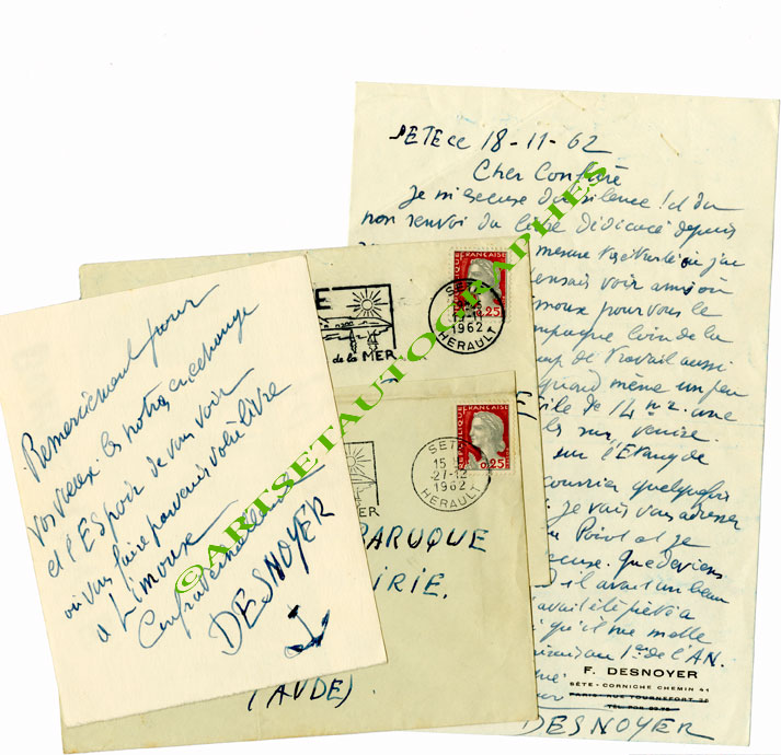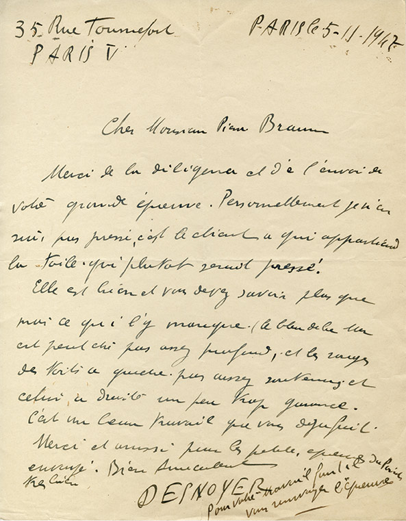 Lettres autographes signéesEnsemble de 5 lettres autographes signées, adressées à Pierre Braun. De 1947 à 1959 ; formats in-4° et in-8° : « Merci [ ] de lenvoi de votre grande épreuve. [ ] Elle est bien et vous devez savoir plus que moi ce qui ly...