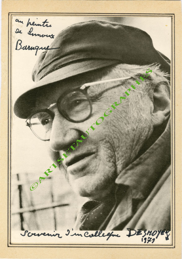 Photographie autographe signée, dédicacéePhotographie signée, dédicacée au peintre Constant Baruque. 1979 ; 205 x 295 mm, collée sur un support cartonné de 207 x 295 mm. Photogravure en noir et blanc, le représentant de profil. « Au peintre de Limoux, Baruque, souvenir...