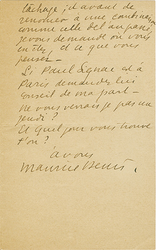 Lettre autographe signéeLettre autographe signée, adressée à M. Lassaigne. 13 avril 1948 ; 1 page in-4°. « Avec regret de ne pas vous avoir vu, je vous communique par ce mot détails de prix que vous me demandez. Comme convenu, je vous laisse au prix...