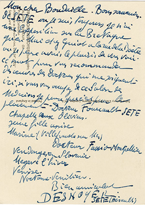 Lettre autographe signéeLettre autographe signée, adressée au critique dart Georges Boudaille. Sans date ; 1 page in-4°. « Mon cher Boudaille. Bon souvenir de Sète où je suis toujours, je nai une exposition sur la Bretagne quen mai chez Guiot à la...