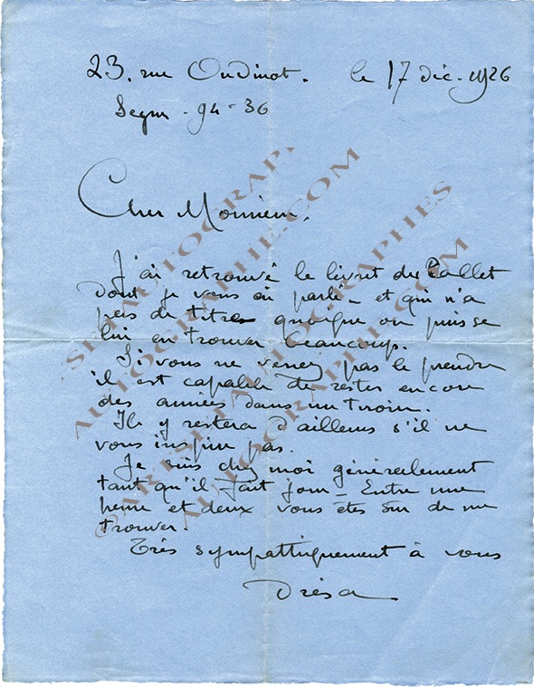 Lettre autographe signéeLettre autographe signée, adressée à Roland-Manuel. Paris, 17 décembre 1926 ; 1 page in-4°. « J’ai retrouvé le livret du ballet dont je vous ai parlé et qui n’a pas de titre. […] Si vous ne venez pas le prendre, il est capable...