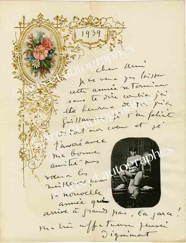 Lettre autographe signéeLettre autographe signée, adressée au peintre E. Heuzé. 1939 ; 1 page in-4° avec un chromo de médaillon de fleurs entouré d’un décor doré. « Je ne veux pas laisser cette année se terminer sans te dire combien j’ai été...