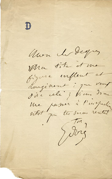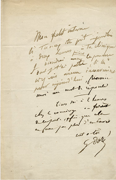 Lettre autographe signéeLettre autographe signée, adressée au docteur Armand Desprès [1834-1896] (grand ami et collectionneur de lartiste). Sans date ; 1 page in-8°. « Mon petit interneSi tu veux être prêt aujourdhui à deux heures précises à ta...