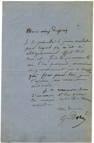 Lettre autographe signéeLettre autographe signée, adressée au docteur Armand Desprès [1834-1896] (grand ami et collectionneur de lartiste). Sans date ; 1 page in-8°. « Je te présente le jeune malade pour lequel tu mas si obligeamment offert tes...