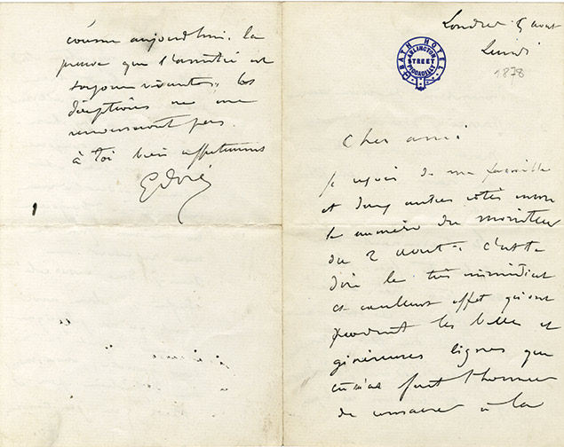 Lettre autographe signéeLettre autographe signée, adressée à un ami. Londres 5 août [1878] ; 3 pages et demie in-8 à en-tête du Bath Hotel.Il le remercie pour son article du Moniteur sur sa sculpture Le Poème de la Vigne, vase monumental montré à...