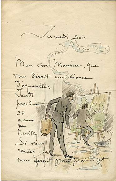 Lettre autographe signéeLettre autographe signée « William », adressée un aquarelliste nommé « Maurice » [Leloir ?]. Samedi soir ; 2 pages in-8° illustrées d'un très beau dessin aquarellé représentant deux peintres....