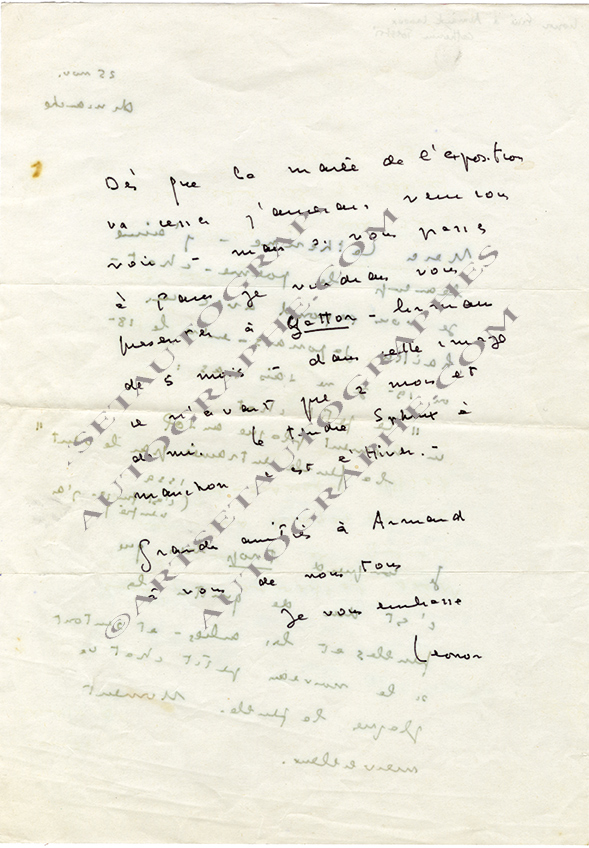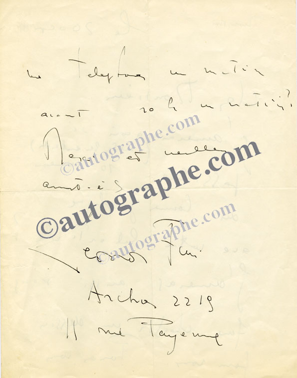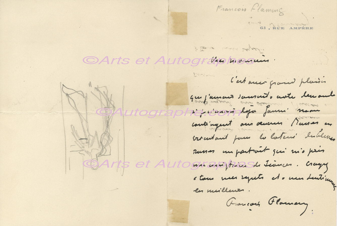 Lettre autographe signéeLettre autographe signée. 1 page in-8°, traces de papier collé en marge ; un dessin figure au dos. « C’est avec grand plaisir que j’aurais souscrit à votre demande si je n’avais déjà fourni mon contingent aux œuvres en...