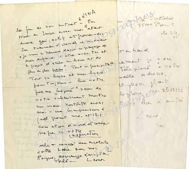 Lettre autographe signéeLettre autographe signée, adressée à Jean René Thomé. Archies, 20 octobre [1955] ; 2 pages in-4°. « J’aimerais avoir si possible (achetés bien entendu) 10 numéros du Cours graphique avec votre bel article. J’aimerais aussi vous...