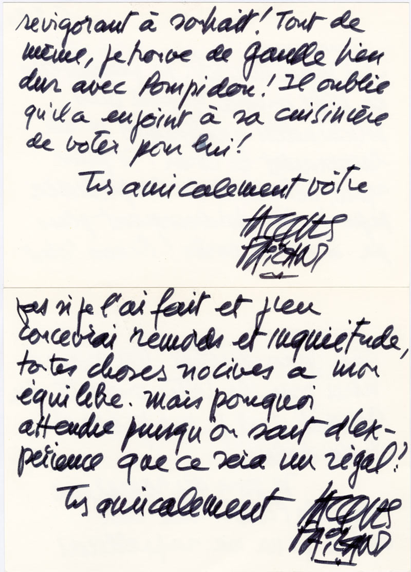 Lettre autographe signéeEnsemble de 2 cartes autographes signées, adressées à Jean-Michel Royer. Sans date et 1990 ; 2 pages in16 oblongues.— Sans date. « Un grand merci pour la lettre ouverte du général [de Gaulle], dont je me promets mille délices. Je...
