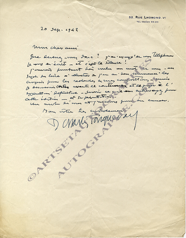 Lettre autographe signéeLettre autographe signée, adressée à un éditeur. Paris, 20 septembre 1942 ; 1/2 page in-4°. « Que devenez-vous donc ? Et c’est le silence ! J’aurais pourtant bien voulu un mot de vous, un sujet du livre à illustrer. J’en ai...