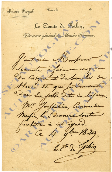 Pièce autographe signéePièce autographe signée. 4 septembre 1829 ; 1 page in-8° avec en-tête imprimé « Musée Royal — Le Comte de Forbin, Directeur général des Musées Royaux ». Il s’agit d’une autorisation pour que M. Lecomte puisse « faire un...