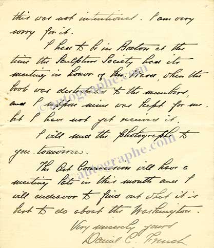 Lettre autographe signéeLettre autographe signée, adressée à la romancière britannique Mary Kimball Ward. 3 février (ou juin) 1912 ; 2 pages in-8°, sur papier gravé à son adresse à Chesterwood- Glendale, Massachusetts, en anglais.« It seems [...] there...