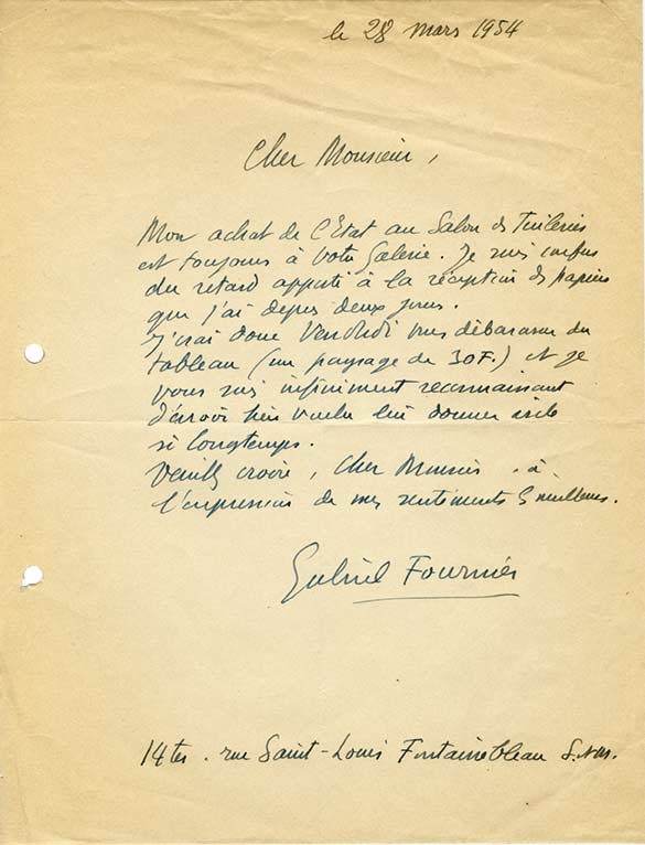 Lettre autographe signéeLettre autographe signée, adressée à Raymond Nacenta, directeur de la galerie Charpentier. Paris, 17 janvier 1952 ; 1 page in-4°.« Je vous prie de trouver ici l’expression de nos plus vifs remerciements pour les deux cartes...